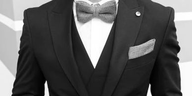 Formal black attire, with black tuxedo, white shirt, black tie and appropriate vest.